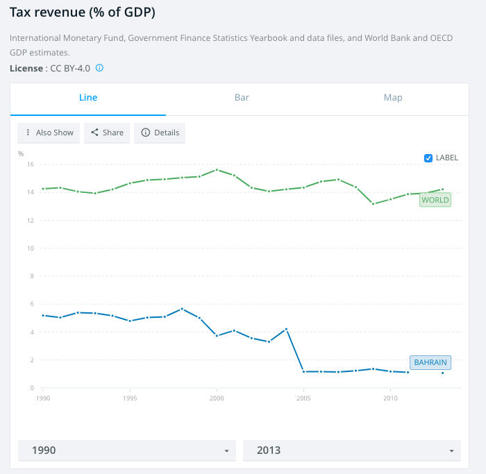 Exhibit 2: The comparison between Tax Revenue as a percentage of GDP of the World and Bahrain. Source: World Bank