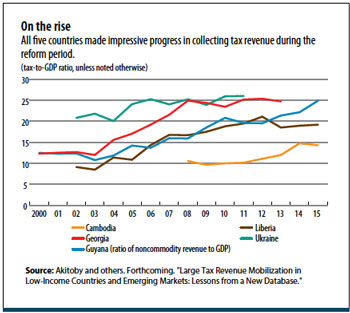 Exhibit 10, cited in Akitoby 2018, depicts the trend of five low-income, emerging economies that achieved successful tax reforms between the years of 2000 and 2015; these countries included Cambodia, Liberia, Ukraine, Georgia, and Guyana. Of the five countries, Georgia had the most significant increase from 12% to 25% Tax Revenue to GDP ratio within the time frame (Akitoby, 2018). Before the reforms, corruption, tax evasion and theft of government funds reserved for public spending were rampant and parallels can be drawn to the MENA region. However, following the Rose Revolution in 2003 in Georgia, rallies for better governance and reduced corruption, new governments in Ukraine, Liberia and Georgia implemented wildly successful tax reforms (Chollet and Gordon, 2005).